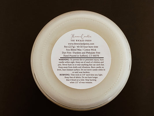 Get ready to elevate your ambiance with Harmon Candles, exclusively from The Wicked Press! These aren’t your grandma's candles—our fun, hand-poured creations are crafted with love using parasoy wax, so you can indulge without guilt. We only use the crème de la crème of fragrance oils—totally paraben-free and phthalate-free—because who is ok with that toxic nonsense? Our scents are absolutely scrumptious and will have your space smelling divine in no time. And don't worry, we are all about the love; no animals were harmed in the making of our fabulous candles. So why wait? Light up your life!