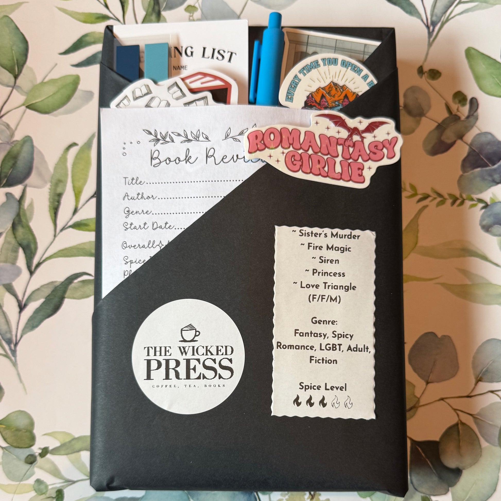Each of our "Blind Date with a Book" comes with various stickers (3-4), bookmarks, annotation tabs, and a pen. Each book condition is new, and every month we curate a distinct selection of books.