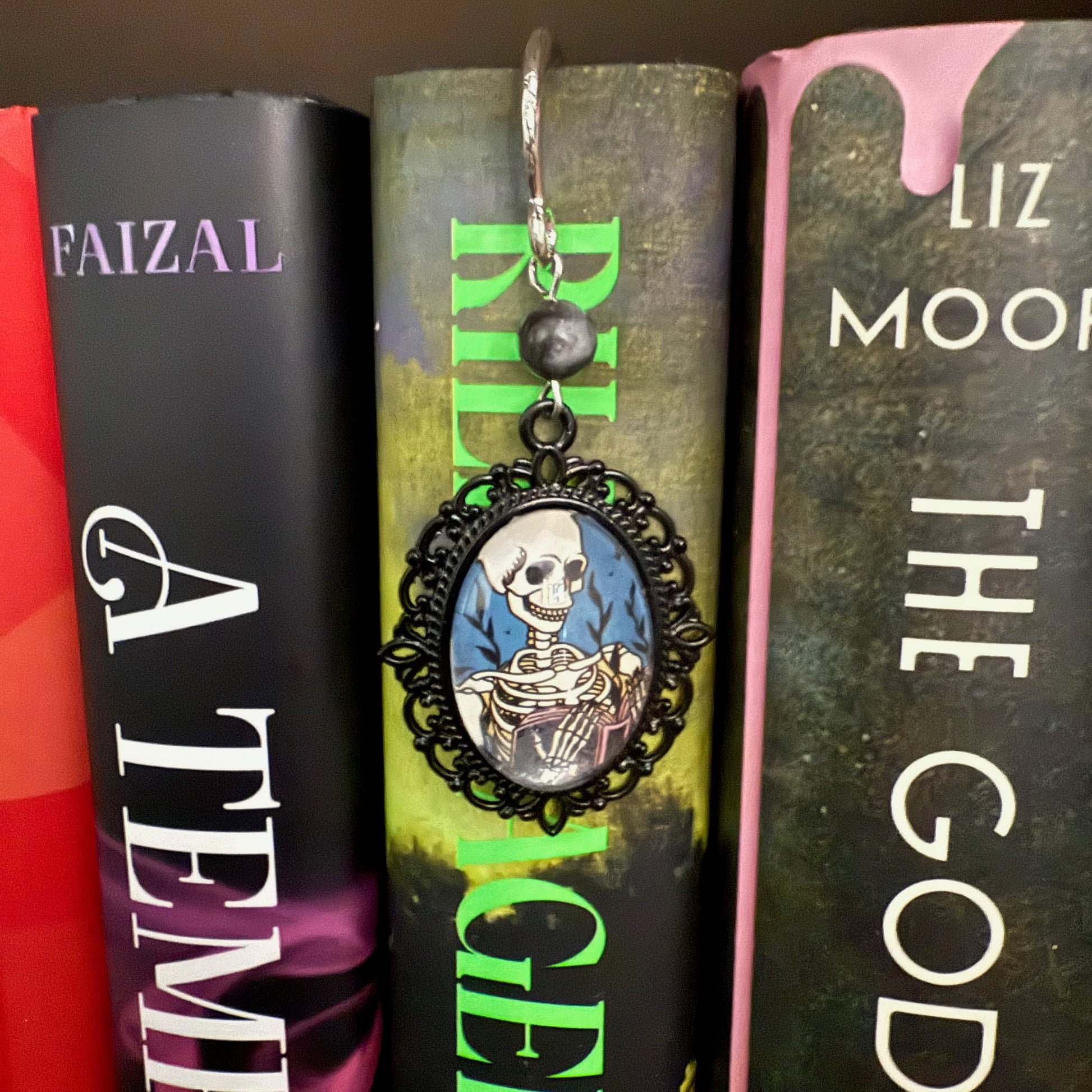 Sturdy silver tone bookmark with dangling accent. Book hooks work by sliding the long metal shaft down between the pages of your book like a traditional bookmark, allowing the accent to dangle along the spine.